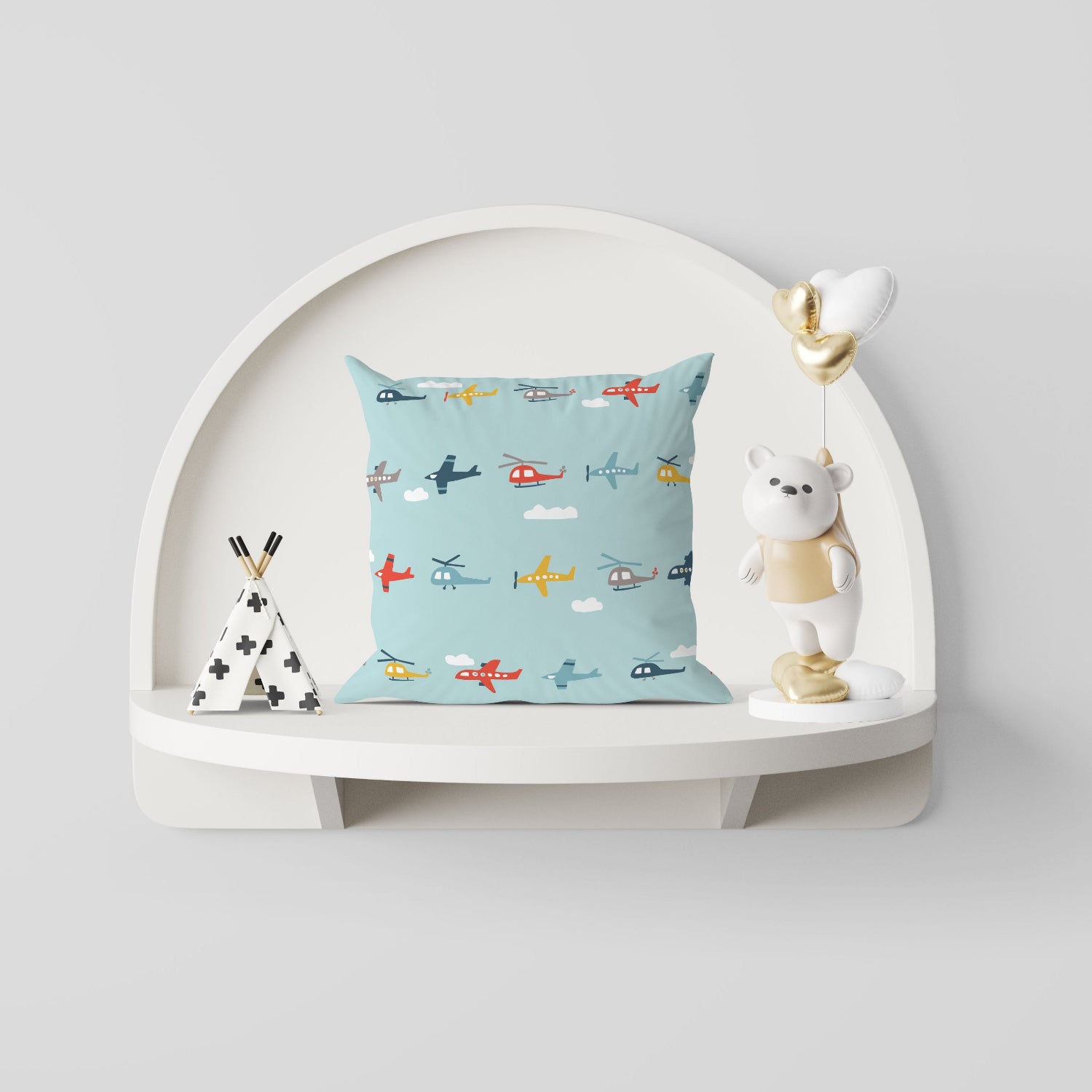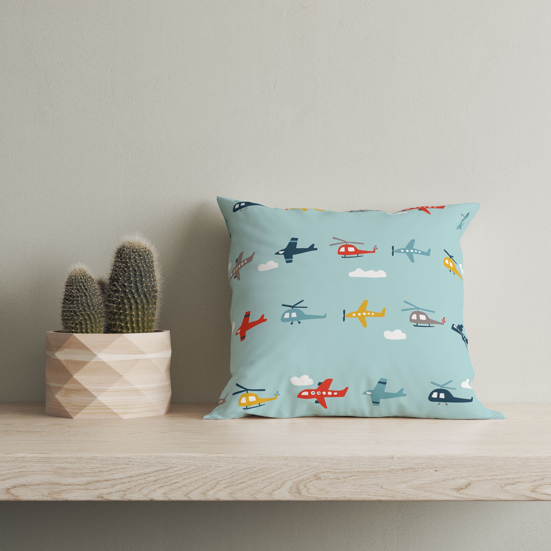 Brighten up your child's room or nursery effortlessly with our vibrant throw pillows. Designed with cheerful and playful patterns, these pillows will charm your little one while adding a stylish touch to the space. This particular design showcases an exciting mix of airplanes, helicopters, and clouds, making it perfect for any young aviation enthusiast.