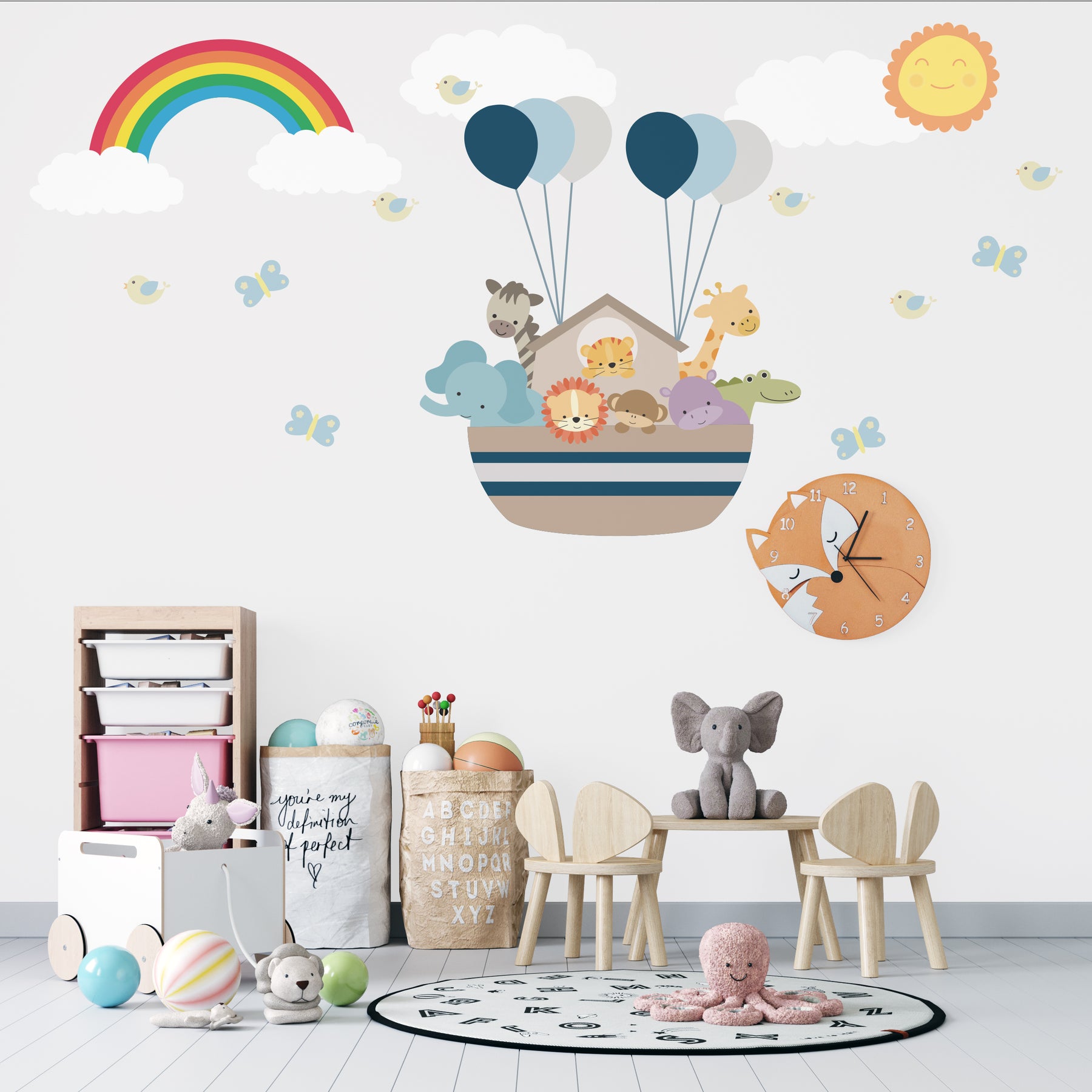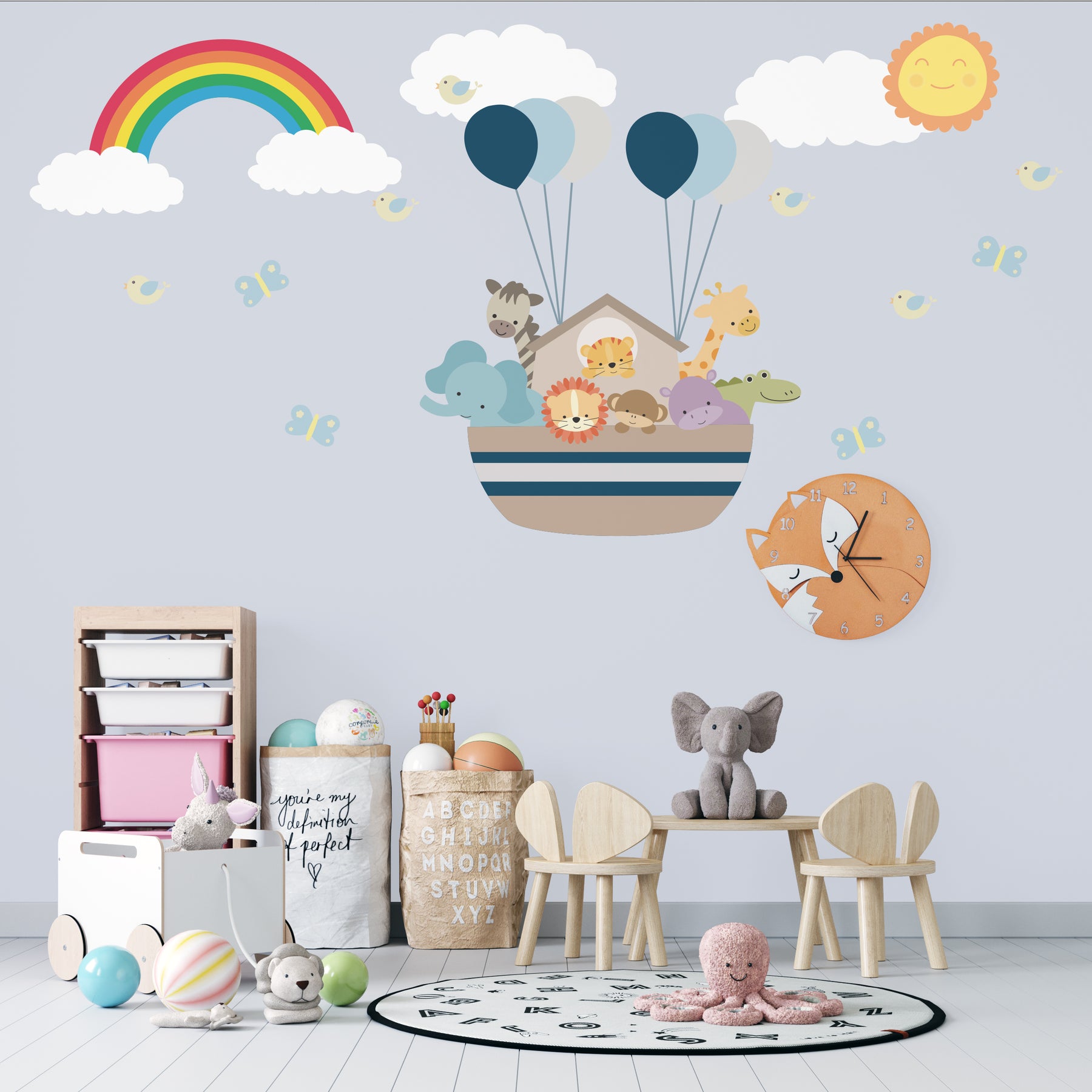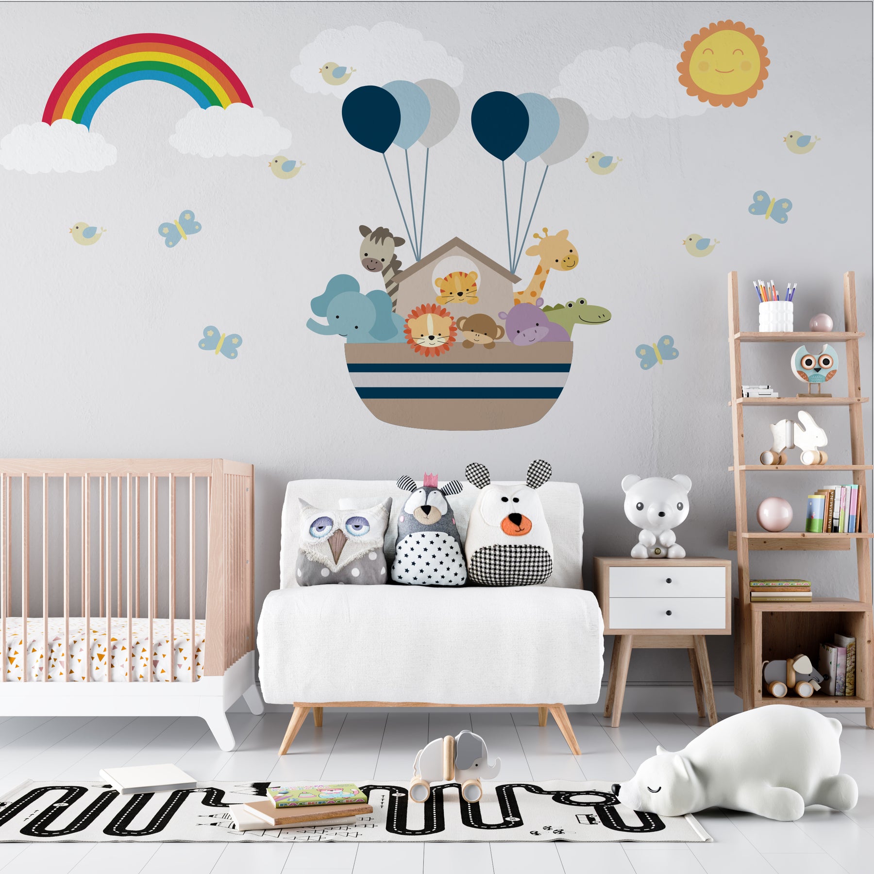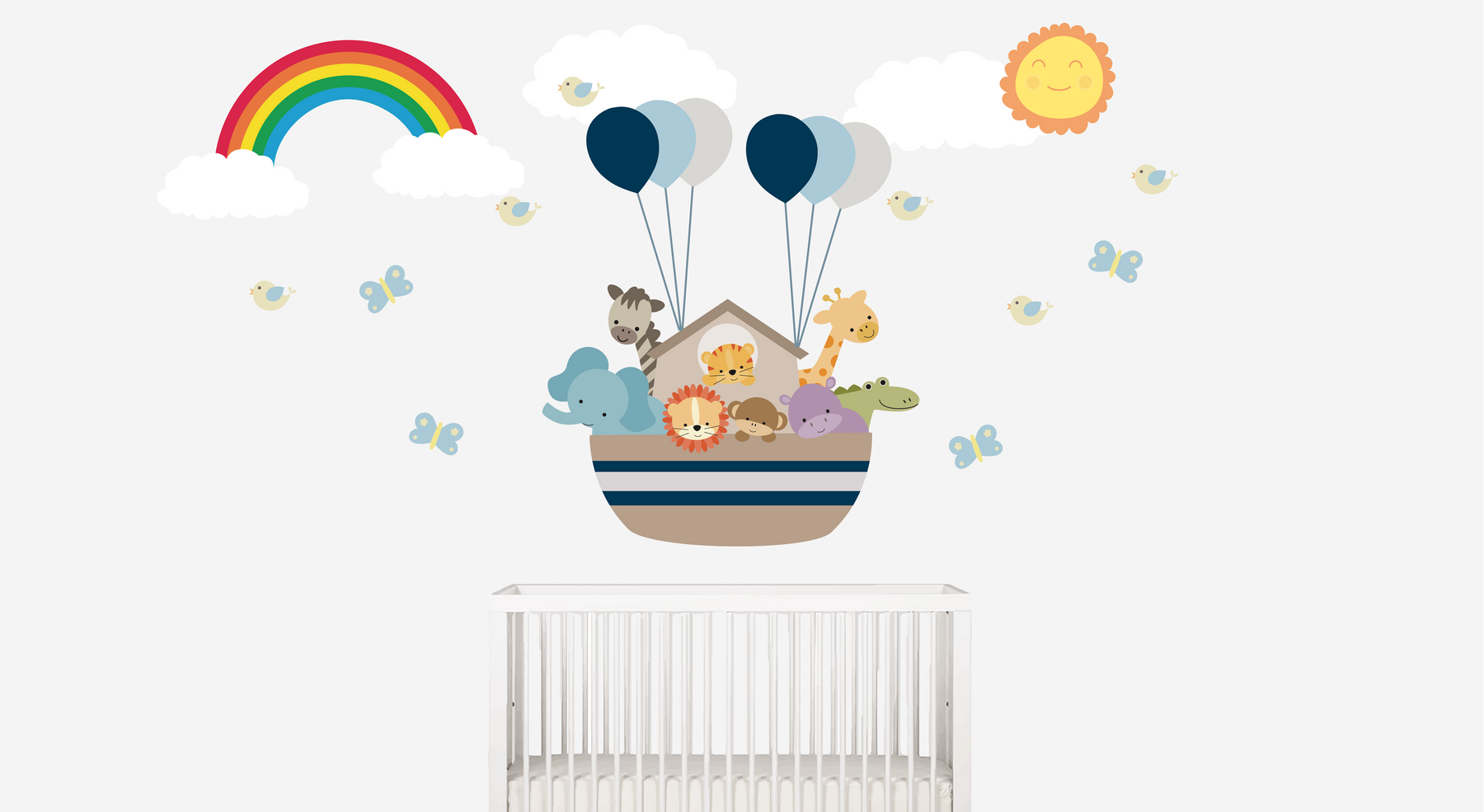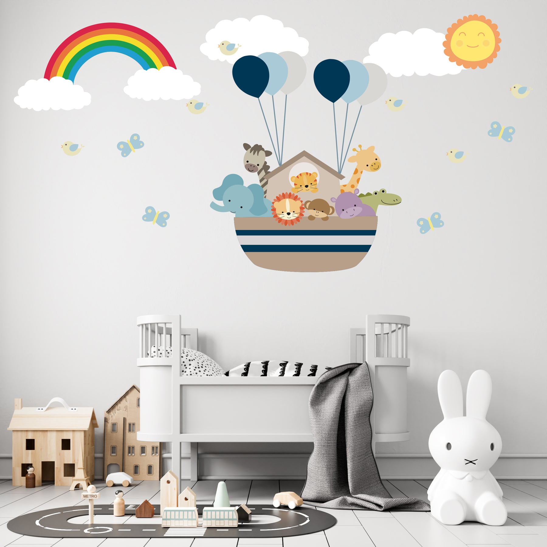 Create a magical vibe in your child’s nursery, playroom, or bedroom with our charming Noah’s Ark wall decals. This delightful set showcases a cute ark surrounded by playful jungle animals, bright blue and grey balloons, gentle clouds, cheerful birds, a colorful rainbow, fluttering butterflies, and a glowing sun, bringing every corner to life.