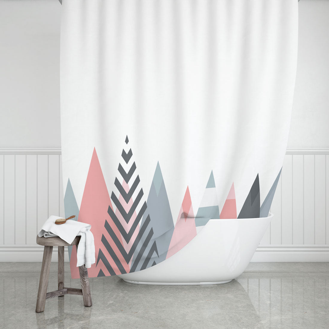 Elevate your bathroom decor with our stunning Mountains shower curtain! Immerse yourself in the serenity of a majestic mountain landscape with soft, calming colors and a sleek geometric design.